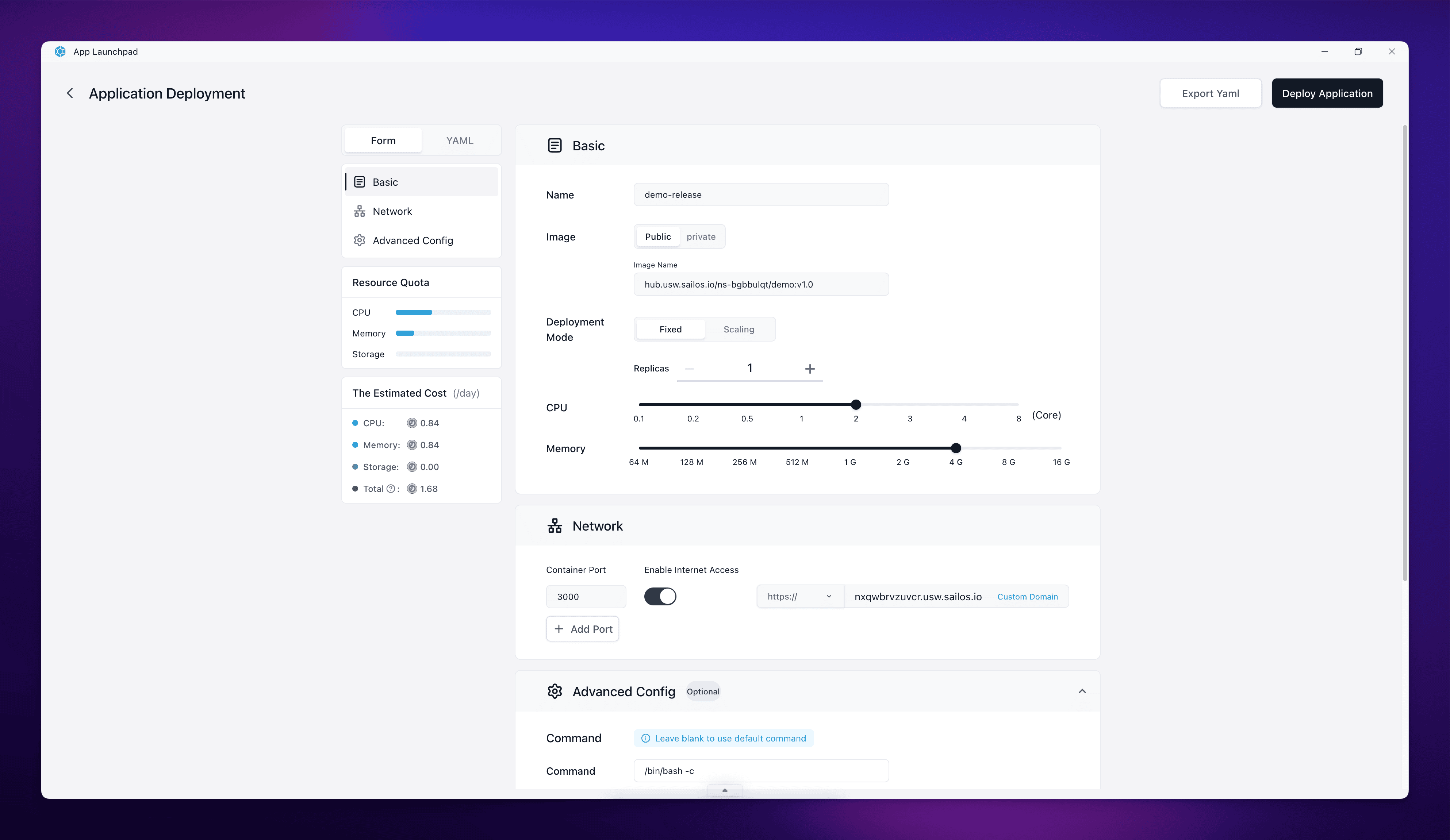 In the App Launchpad application, follow the deployment wizard to configure your application settings. This may include: